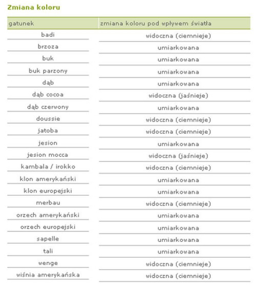 Odporność na zmiany wywołane światłem słonecznym. Z biegiem czasu, pod wpływem światła słonecznego (a dokładnie promieni UV), produkty wykonane z drewna zmieniają swój odcień. Jest to proces w pełni naturalny, ale nie wszystkie gatunki drewna reagują w ten sam sposób. Niektóre gatunki dość szybko zmieniają barwę, inne dopiero po kilku latach. Wybierając podłogę, należy zwrócić uwagę jak będzie padało światło słoneczne w danym pomieszczeniu.