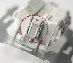 Po drugie - samopowrotne pazurki wyposażone w nierdzewne elementy sprężynujące znacznie ułatwiają montaż modułu łącznika w puszcze instalacyjnej, a dodatkowo boczne wyprowadzenie przewodów umożliwia kontrolę jakości ich przyłączenia do zacisku, już po ostatecznym zainstalowaniu w puszce.