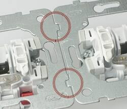 Po trzecie - bazujące elementy dystansowe są umieszczane w osprzęcie z serii AS oraz Sonata firmy Ospelna mostkach, dzięki czemu zapewniają idealny rozstaw i wzajemne położenie modułów w puszkach wielokrotnych. Dzięki temu bez problemu, zgodnie z zasadami bezpieczeństwa można wykonać instalację w dowolnej konfiguracji.