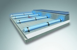 oraz systemowej izolacji Rolljet/Noppjet i rozdzielaczy ze stali nierdzewnej ze wskaźnikami przepływu. Całość przykrywa się standardowej grubości wylewką jastrychową ok. 65 mm.