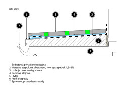 Najpopularniejszym rodzajem balkonu jest konstrukcja wykonana na żelbetowej płycie wspornikowej, koniecznie połączonej z wieńcem kondygnacji lub nadprożem. W takim przypadku stanowi ona od razu gotowe podłoże do wykonania posadzki. Pamiętajmy jednak, że jej grubość musi przekraczać 8 cm, ponieważ tylko wtedy możliwe będzie zamocowanie balustrady. Zbrojenie płyty wspornikowej wykonuje się z użyciem stali zbrojeniowej żebrowanej, a pręty są mocowane do nadproża górą i dołem. Ten sposób wykonania balkonu sprawia jednak problem z izolacja termiczną, gdyż największe ubytki ciepła następują w miejscu zakotwiczenia płyty w wieńcu. Aby temu zapobiec należy zaizolować całą płytę, ważna jest również hydroizolacja. Tu doskonale sprawdzą się tzw. płynne folie, masy uszczelniające lub powłoki polimerowe. Również w przypadku balkonów należy pamiętać o odpowiednim nachyleniu płyty. Jej wyprofilowanie sprawi, że woda nie będzie zalegać na powierzchni. Balkon koniecznie musi zostać wyposażony w balustradę, która zapewni użytkownikom bezpieczeństwo.