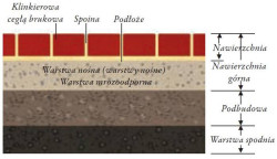 Na tak przygotowaną górną płaszczyznę najwyższej warstwy nośnej, kładzie się nawierzchnię: podsypkę i klinkierową cegłę brukową. Podsypka pod bruk jest wykonywana z kruszywa o uziarnieniu 0/4, 0/5 lub 0/8 mm. Odpowiedni materiał to np. mieszanka mączki/drobnego grysu z twardego kamienia, takiego jak bazalt czy diabaz. Materiał podsypkowy należy rozprowadzić, przy uwzględnieniu wskaźnika zagęszczenia, na warstwę o równomiernej grubości. Podczas rozprowadzania materiału podsypkowego na warstwę o równomiernej grubości bardzo pomocne jest zaznaczenie linii sznurkiem. Wstępne zagęszczanie materiału podsypkowego jest istotnym warunkiem przygotowania nawierzchni pod układanie bruku klinkierowego. W ten sposób minimalizuje się późniejsze, nieuniknione osiadanie gruntu. Wysokość warstwy należy stale kontrolować.