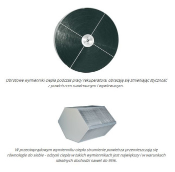 Typ wymiennika ciepła decyduje o typie rekuperatora. Wymiennik obrotowy = centrala obrotowa, wymiennik przeciwprądowy - centrala przeciwprądowa, wymiennik ciepła krzyżowy = centrala krzyżowa. W zależności również od typu, wymiennik ma różne kształty: romba w wymiennikach płytowych (przeciwprądowych lub krzyżowych) lub koła, a właściwie walca, w obrotowych.