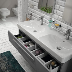 Meble powinny pozostać spójne z ogólną koncepcją, w jakiej chcemy stworzyć łazienkę. Dobrym wyborem będą z pewnością geometryczne kształty umywalek (np. umywalka KOŁO MADISON) i toalet (np. miska Rimfree KOŁO LIFE!), nieskomplikowane szafki i stonowane kolory, a także ciekawe sposoby montażu, ostatnio trendem jest używanie palet w przestrzeniach. Im prostszy wygląd , tym lepiej.