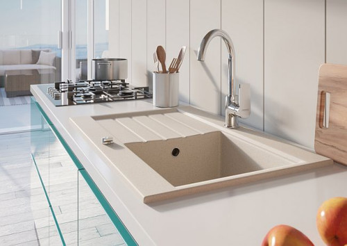 W tej nowoczesnej, przestronnej, ale przytulnej i ciepłej aranżacji doskonale zaprezentują się: granitowy zlewozmywak w kolorze piaskowym i bateria sztorcowa Algeo Square. Materiał, z którego został wykonany zlewozmywak jest niezwykle wytrzymały i trwały, odporny na zarysowania i pęknięcia, a jednocześnie bardzo elegancki. Nic więc dziwnego, że zlewozmywaki granitowe cieszą się coraz większym powodzeniem i uznaniem użytkowników. Przy zmywarce w zabudowie jednokomorowy zlew z ociekaczem jest wystarczający do mycia produktów spożywczych i niewielkiego zmywania. Kwadratowy model Ozzy z przelewem i automatycznym korkiem został wykonany przy użyciu najnowocześniejszych technologii z wykorzystaniem barwionego kamienia kwarcowego, żywicy i specjalnego utwardzacza. Nie tworzy się na nim osad, nie odbarwia się, a jego wysoką jakość potwierdza dziesięcioletnia gwarancja producenta. Piaskowy kolor i naturalna faktura znakomicie harmonizują z wakacyjnym wystrojem całego pomieszczenia, a w zestawieniu z baterią Algeo Square podkreślają wysoki standard wnętrza. Bateria posiada wysoką, łukowatą, obrotową wylewkę, dzięki czemu bez trudu napełnimy wodą każde naczynie, nawet wysoki garnek. Płaski, dobrze układający się w dłoni uchwyt zaprojektowano w oryginalny i jednocześnie bardzo praktyczny sposób: skierowany ku górze, równolegle do korpusu zajmuje bardzo mało miejsca i nie wystaje poza obudowę komory zlewu, przez co wykorzystamy ją w całości. Wyposażona w regulator ceramiczny i regulator strumienia bateria została wykonana z materiałów najwyższej jakości i pokryta elegancką chromowaną powłoką.