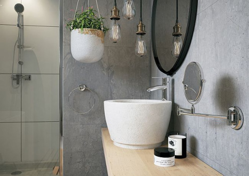 Uspokajająca szara barwa płytek imitujących beton przełamana została czernią łazienkowych gadżetów. Do tego biel posadzki i ceramiki świetnie komponująca się z naturalnymi odcieniami brązu i beżu drewnianych detali. Roślinność znajdująca się w pomieszczeniu doskonale je ożywia i ociepla, kreując klimat odpowiedni do wypoczynku. A nowoczesne lampy loftowe z dekoracyjnymi żarówkami znakomicie rozjaśniają wnętrze. Jednak najważniejszą cechą tej oryginalnie zaaranżowanej łazienki jest wielofunkcyjność.