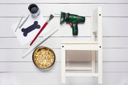 Czarną matową farbą lub farbą tablicową wypełnij przyklejony szablon z folii. Odczekaj trochę, zanim odkleisz folię od oparcia krzesła. Jeśli zrobisz to zbyt gwałtownie bądź zbyt wcześnie, krawędzie psiej kostki mogą wyglądać nieestetycznie. Kiedy już będziesz pewny, że powierzchnia wyschła, odklej folię. Białym markerem na czarnej farbie lub kredą na farbie tablicowej możesz napisać dowolne słowo, np. "JEDZENIE", "PICIE" albo - imię swojego pupila. Teraz pozostaje już tylko napełnić miskę jedzeniem i włożyć ją w wycięty wcześniej otwór w krześle.