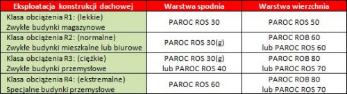 Dobór rozwiązania termoizolacyjnego w żadnym stopniu nie zależy od rodzaju konstrukcji nośnej. Płyty izolacyjne działają jak warstwy rozprowadzające obciążenie mechaniczne. Oznacza to, że właściwości wytrzymałościowe zarówno materiału izolacyjnego, jak i pokrycia dachowego, powinny sobie odpowiadać. Obok parametrów termicznych, wyboru konkretnych produktów należy więc dokonywać w oparciu o wymaganą klasyfikację ogniową oraz właściwości mechaniczne. Na dachy płaskie działa wiele różnych obciążeń, które także należy uwzględnić przy wyborze produktów izolacyjnych. Z uwagi na wytrzymałość na ściskanie oraz naprężenia ściskające płyt izolacyjnych, badana zgodnie z normą EN 826 (przy 10% deformacji lub ugięciu lub zniszczeniu), zaleca się stosowanie następujących rozwiązań: