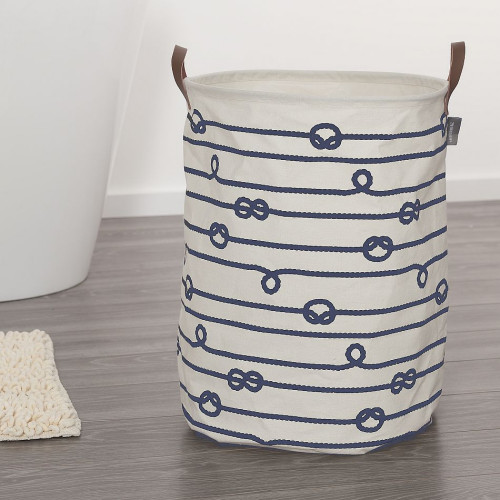 - Łazienka w stylu marynistycznym musi się nie tylko pięknie prezentować, ale być także bardzo funkcjonalna. Nie można więc zapomnieć o praktycznym koszu na pranie wykonanym z grubego materiału, który nie zajmuje wiele miejsca. Kosz Rope ma wzór przywołujący skojarzenia z żeglarskimi linami.