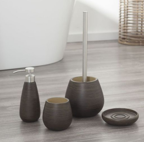 Jeśli wolisz postawić na drewniane dodatki w stylu village, koniecznie wybierz kolekcję Miyagi marki SEALSKIN. Te wykonane ze sztucznego tworzywa elementy doskonale imitują prawdziwe drewno. W tej kolekcji, charakteryzującej się obłymi kształtami, dostępne są cztery elementy: mydelniczka, dozownik do mydła, szczotka do toalety ze stojakiem i kubeczek.