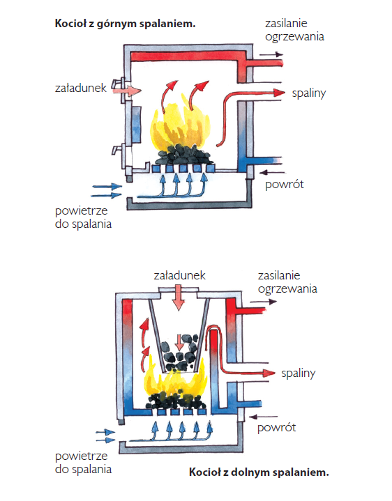 Z tego powodu urządzenia te uznawane są za mniej toksyczne. Charakteryzują się też wyższą sprawnością, ale muszą być zasilane paliwem granulowanym dobrej jakości, np. węglem kamiennym typu orzech lub groszek.