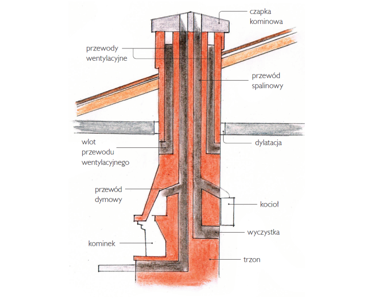 - wentylacyjne – przeznaczone są do odprowadzania powietrza w systemie wentylacji grawitacyjnej. Ich wymiary to najczęściej 14 × 14 cm (lub średnica 15 cm). Zaleca się grupowanie w jednym kominie kilku kanałów o różnym przeznaczeniu. Kominy utrudniają bowiem aranżację wnętrz, dlatego im jest ich mniej, tym lepiej. Poza tym wykonanie komina oznacza konieczność zrobienia otworów w stropie i dachu, co podnosi koszty inwestycyjne. Każdy element wystający z dachu to również miejsce potencjalnych przecieków. Do tego dochodzą kwestie estetyczne – dach, szczególnie niewielkich rozmiarów – wygląda lepiej bez nadmiaru „wypustek”.