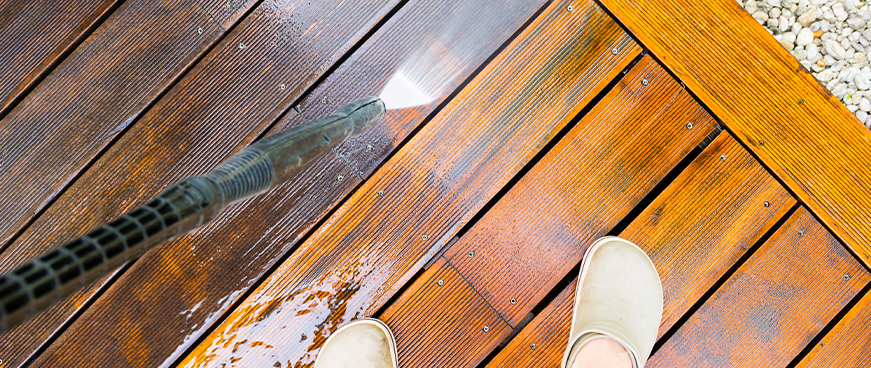 Wcześniej taras należy umyć i usunąć z niego piasek. Po nałożeniu preparatu, taras szorujemy szczotką ryżową i pilnujemy, aby żel nie wysechł - w razie potrzeby zraszamy go wodą. Po 20 minutach spłukujemy wszystko myjką ciśnieniową. Preparat, nie uszkadzając drewna, usuwa z niego brud, tłuszcz, plamy powstałe w wyniku pleśni, rdzy, a także szczerniałe przebarwienia i inne zanieczyszczenia.