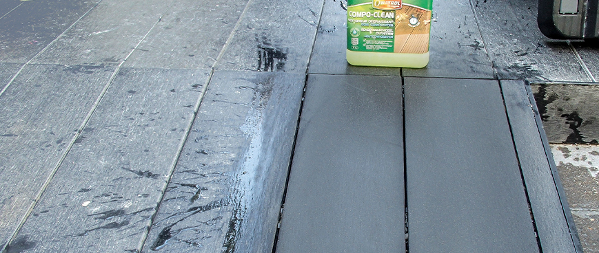 Do zmywania tłuszczu i zabrudzeń – także z rowkowanych desek - świetnie sprawdzi się Owatrol Combo-Clean. Nakłada się go na powierzchnię na 5-15 minut, a następnie szoruje całość szczotką lub pędzlem. Żel spłukuje się myjką ciśnieniową i pozostawia taras do wyschnięcia. Innym preparatem o podobnym działaniu jest Osmo 8021, przeznaczone do czyszczenia kompozytów polimerowych, ale także mebli ogrodowych czy ogrodzeń z tworzyw sztucznych. Koncentrat rozcieńcza się wodą w stosunku 1:20, nanosi na zabrudzone powierzchnie, szoruje szczotką i spłukuje czystą wodą pod ciśnieniem.