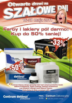 W ramach Szałowych Dni za pół ceny będziemy mogli kupić doskonałe produkty marek Sigma Coatings oraz Dekoral Professional. W ich ofercie znajdziemy wysokiej jakości farby wewnętrzne i zewnętrze, dekoracyjne, grunty i podkłady oraz impregnaty do drewna.