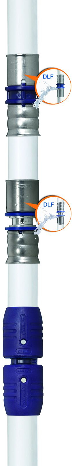 Kształtki Wavin Tigris K1 i M1 posiadają funkcję kontroli nieszczelności przed zaciśnięciem (DLF), która ujawnia każdą niezaciśniętą kształtkę podczas wykonywania próby szczelności. Nieprawidłowości w montażu i zaciśnięciu złączki widoczne są poprzez wyciek wody. Daje to instalatorowi pewność poprawnego wykonania wszystkich połączeń.