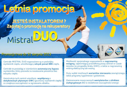 Zobacz ofertę rekuperatorów MISTRAL DUO, zapraszamy do skorzystania z Letnia promocja na rekuperatory Mistral PRO