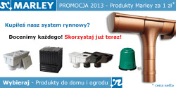 Promocja trwa do 30 listopada 2013 roku. Każda osoba fizyczna (nie firma), która zakupi system rynnowy za minimum 1000 zł netto otrzyma dowolnie wybrany produkt Marley w cenie 1 zł netto (1,23 zł brutto).
