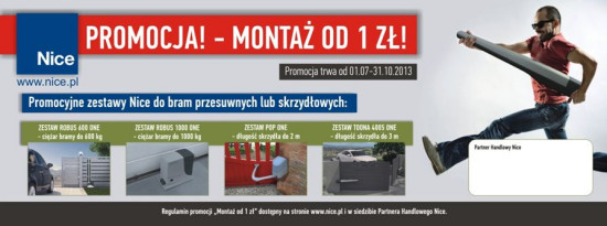 Montaż napędów Nice już za złotówkę! Promocja obowiązuje do końca października lub do wyczerpania zapasów. Szczegółowe informacje można uzyskać u blisko 1 500 Partnerów Handlowych Nice na terenie całej Polski. Promocja łączy się z akcją The Nice Music Stars.