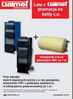 1. Przy zakupie dwóch dowolnych kotłów c.o. bez podajnika, wymiennik 100 l z podwójną wężownicą w żółtej piance poliuretanowej za 1 zł.