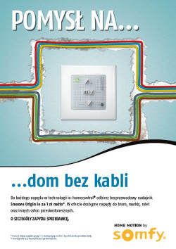Poszczególne elementy modułowej konstrukcji nadajnika są dostępne w różnych wersjach (szeroka gama kolorystyczna obramowań oraz trzy rodzaje panelu), dzięki czemu nadajnik łatwo dostosować do wystroju wnętrza. „Pomysł na dom bez kabli” to dla klientów możliwość zwiększenia komfortu korzystania z automatyki domowej niskim kosztem. Zakupując dowolny napęd w technologii io-homecontrol® przełącznik Smoove Origin io będzie dostępny za 1 zł (zamiast katalogowej ceny ok. 200 zł netto). Promocja trwająca od 12 sierpnia do 31 października będzie wspierania kampanią banerową w Internecie. Z oferty będzie można skorzystać wyłącznie w salonach sprzedaży Somfy Expert (pełna lista salonów znajduje się na www.somfy.pl).