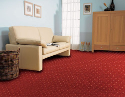 Wykładzina pętelkowa polipropylenowa z dwukolorowej włóczki. Kolor czerwony. Szerokość 4 m, grubość 6 mm. Wyprodukowana w Holandii.