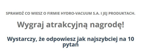II edycja konkursu wiedzy o fabryce pomp i systemów pompowych Hydro-Vacuum S.A. Do wygrania 10 nagród głównych w postaci tabletów, dysków i zegarków oraz 100 gadżetów firmowych Hydro-Vacuum S.A. Do wzięcia udziału w nim firma serdecznie zaprasza.