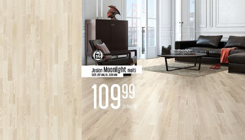Jesionowe drewno zabezpieczono lakierem półmatowym o podwyższonej odporności na scieranie. Jasne drewno oraz trzypasmowa budowa sprawiają, ze idealnie sprawdzi się we wnętrzach o małych rozmiarach.