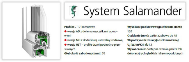 SALAMANDER Window & Door Systems S.A. oferuje trzy systemy wysokiej jakości profili z PVC do budowy okien: bluEvolution, Brügmann i Salamander. Wszystkie systemy okienno-drzwiowe charakteryzują się dosko¬nałymi parametrami technicznymi, umożliwiającymi konstruowanie stolarki budowlanej o różnorakim przeznaczeniu.