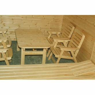 Na zdjęciu meble z drewna sosnowego, wykończone lakierem wodoodpornym.