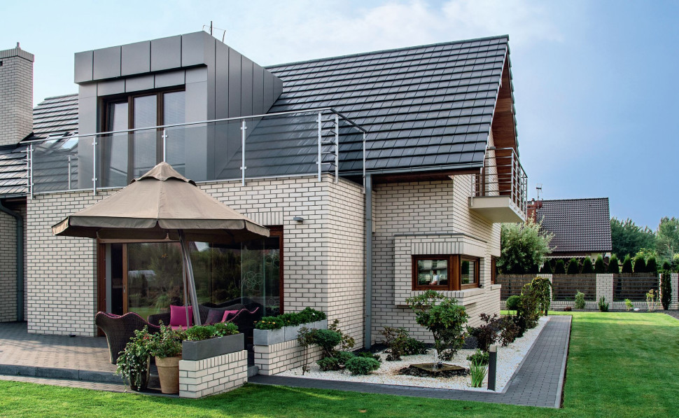 Nowoczesna wersja tradycyjnej bryły z blachą płaską nie tylko na dachu, ale i na części elewacji. (fot. Blachy Pruszyński)