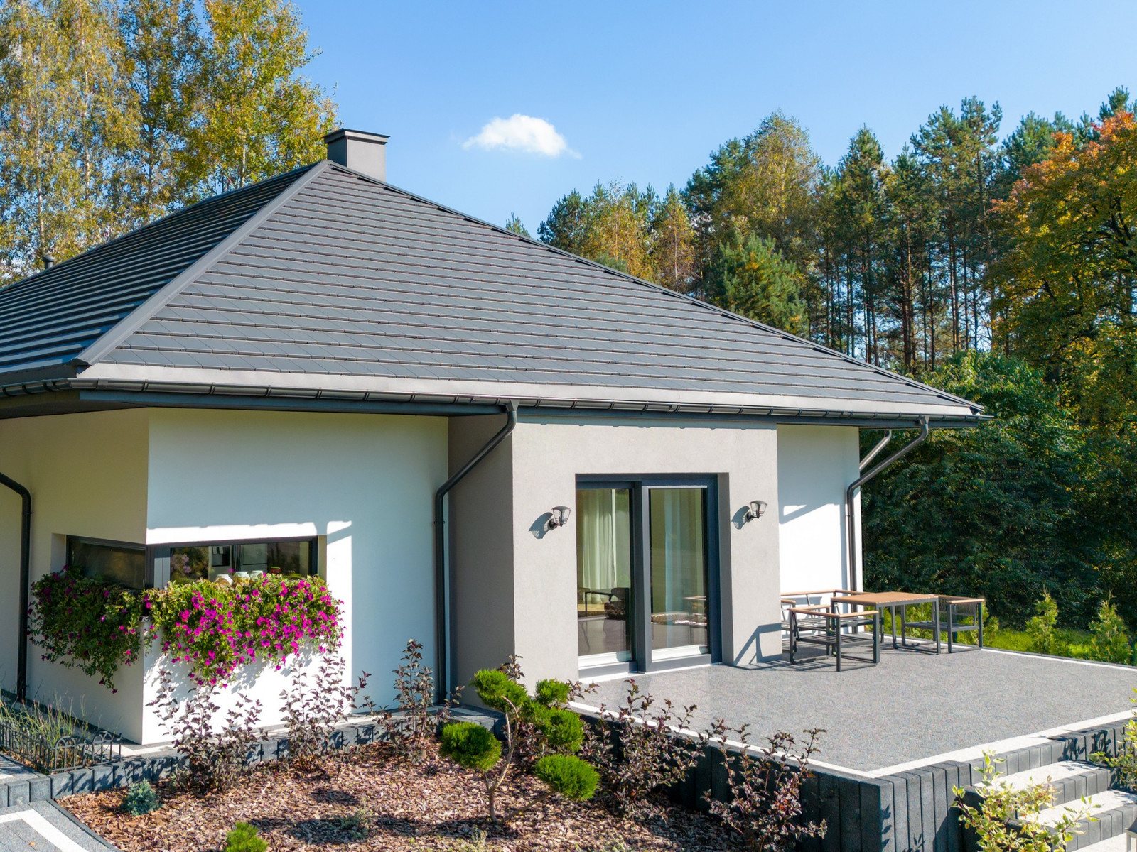 Rozciągające się połacie skutecznie chronią elewację ze wszystkich stron.