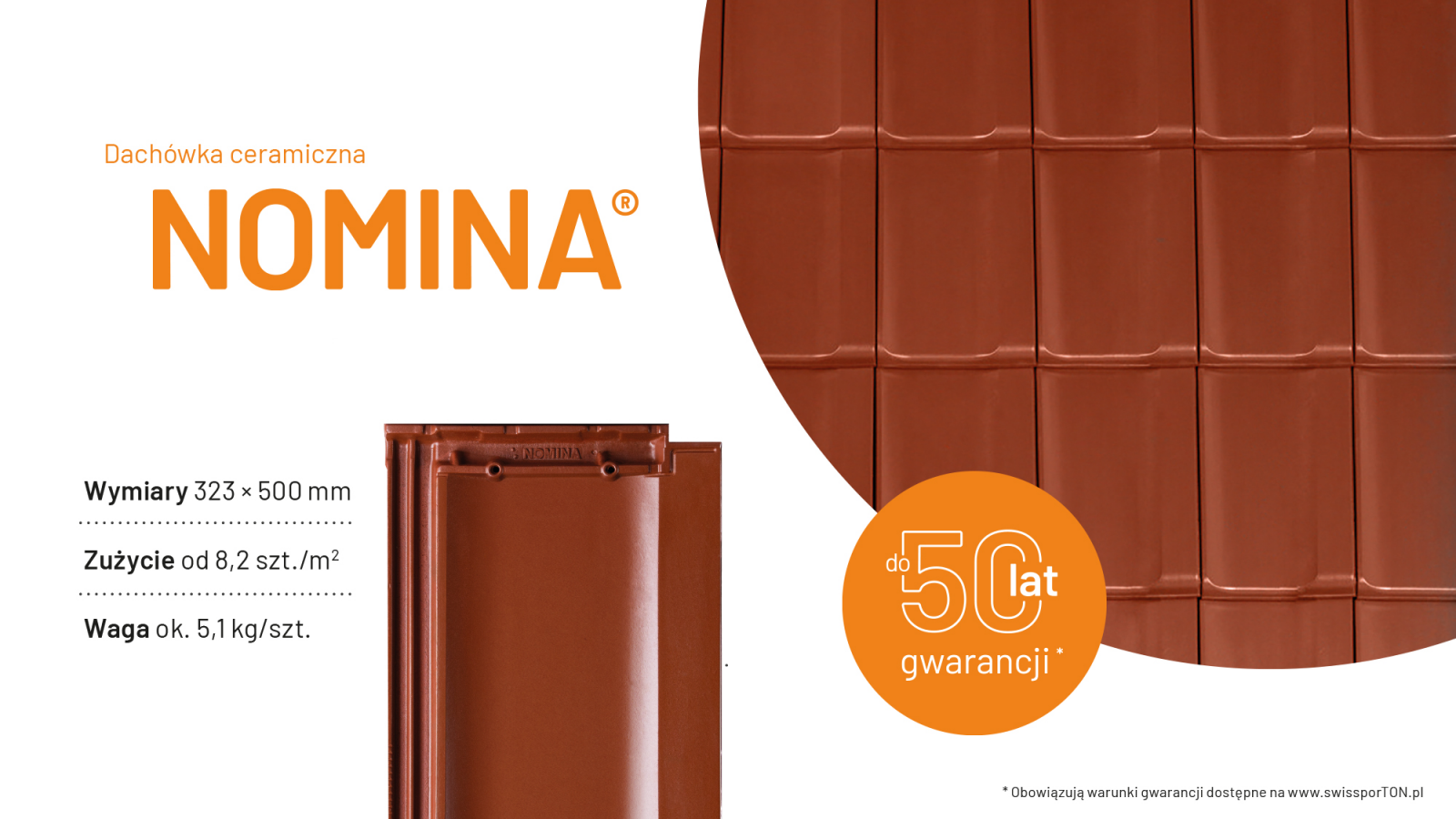 NOMINA to nie tylko pojedynczy produkt - to część szerszej oferty produktów dla nowoczesnego budownictwa w ramach marki parasolowej swisspor. swissporTON to nowa europejska marka pokryć dachowych w Grupie swisspor, wiodącego w Europie producenta energooszczędnych rozwiązań budowlanych od fundamentów po dach. swissporTON czerpie z bogactwa wiedzy, innowacji i szwajcarskiej precyzji, która przekłada się na jakość każdej wyprodukowanej dachówki.