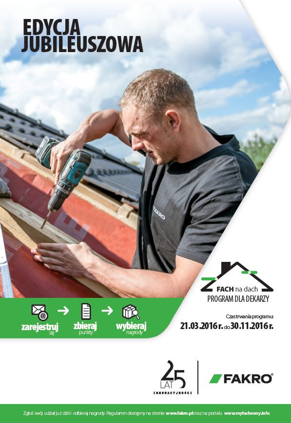 Ruszyła kolejna edycja programu „Fach na dach”. Program ten kierowany jest do fachowców montujących produkty FAKRO. Za spełnienie warunków określonych w regulaminie oraz zebranie odpowiedniej ilości punktów, uczestnicy mogą je wymieniać na produkty lub usługi dostępne w Katalogu Nagród.
