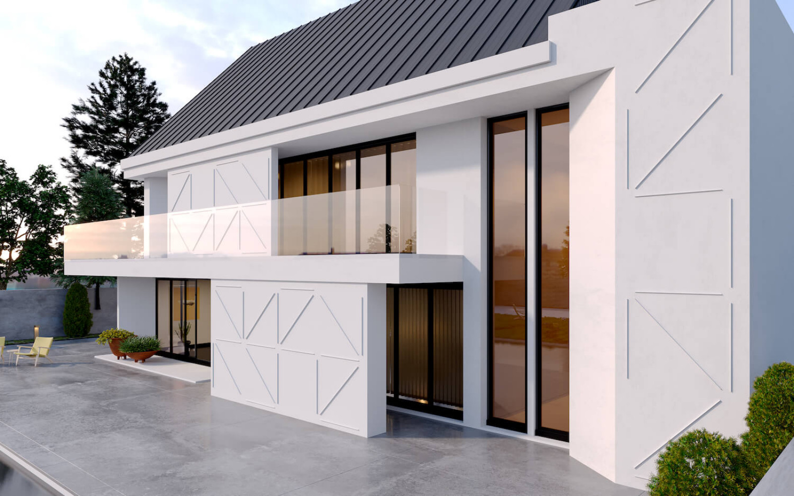 Duże przeszklenia może uznać za kolejny trend w wykończeniu elewacji domu. Okna panoramiczne i narożne sprawiają, że elewacja staje się lżejsza i bardziej otwarta na ogród, a wnętrza są lepiej doświetlone.