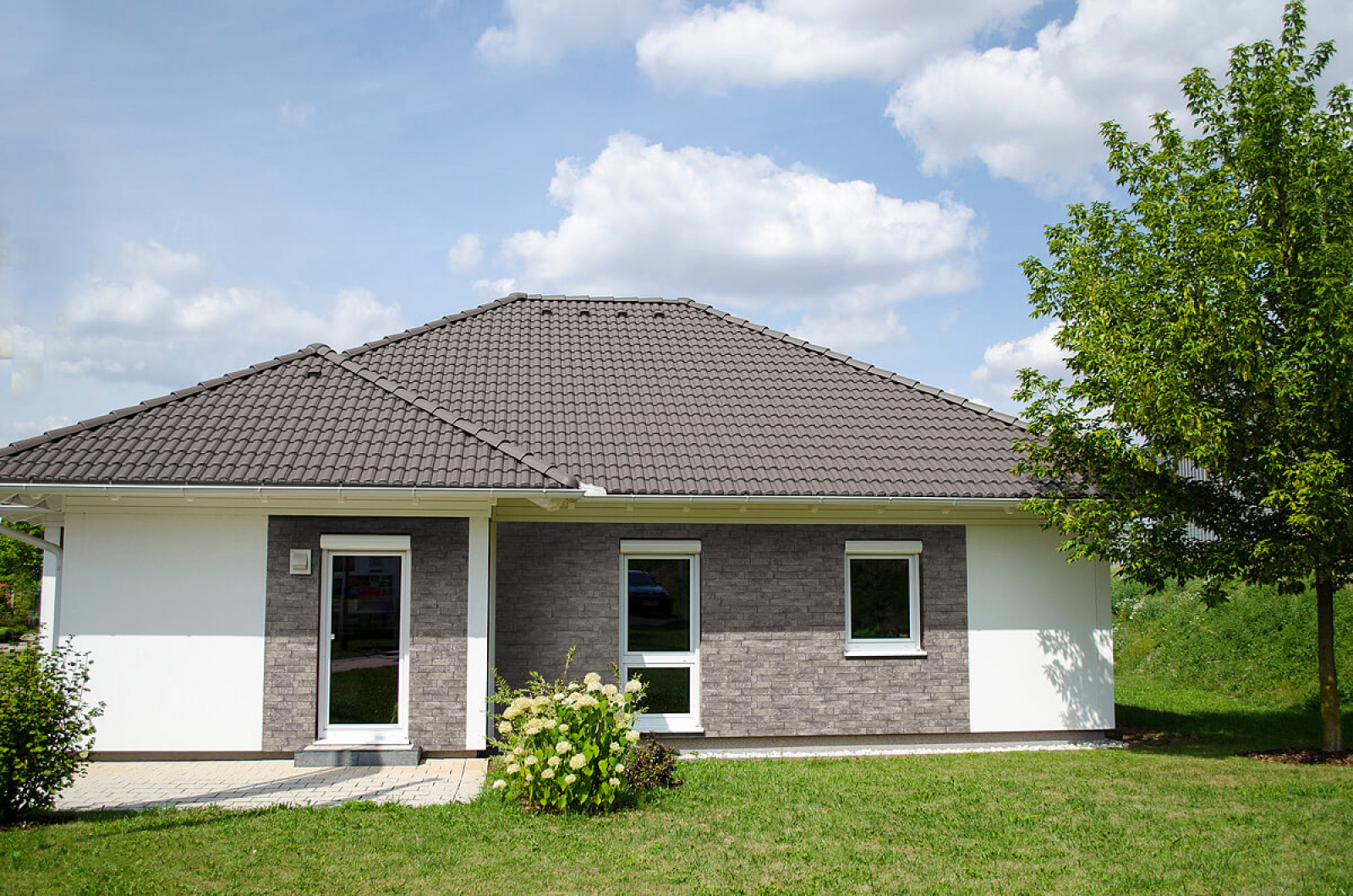 Kolejną opcją na efektowną i modną elewację domu są okładziny z kamienia, cenione za elegancję i wyjątkową trwałość. Marmur, granit czy piaskowiec doskonale prezentują się zarówno na całych elewacjach, jak i na wybranych fragmentach, takich jak cokoły czy detale architektoniczne. Kamień jest materiałem bardzo trwałym, ale też drogim i ciężkim, dlatego w przypadku montażu na ścianach dwuwarstwowych konieczne jest zastosowanie stalowych kotew mocowanych do ściany nośnej. Ciekawą imitacją kamienia na elewacji są płytki z betonu, które są tańsze i lżejsze.