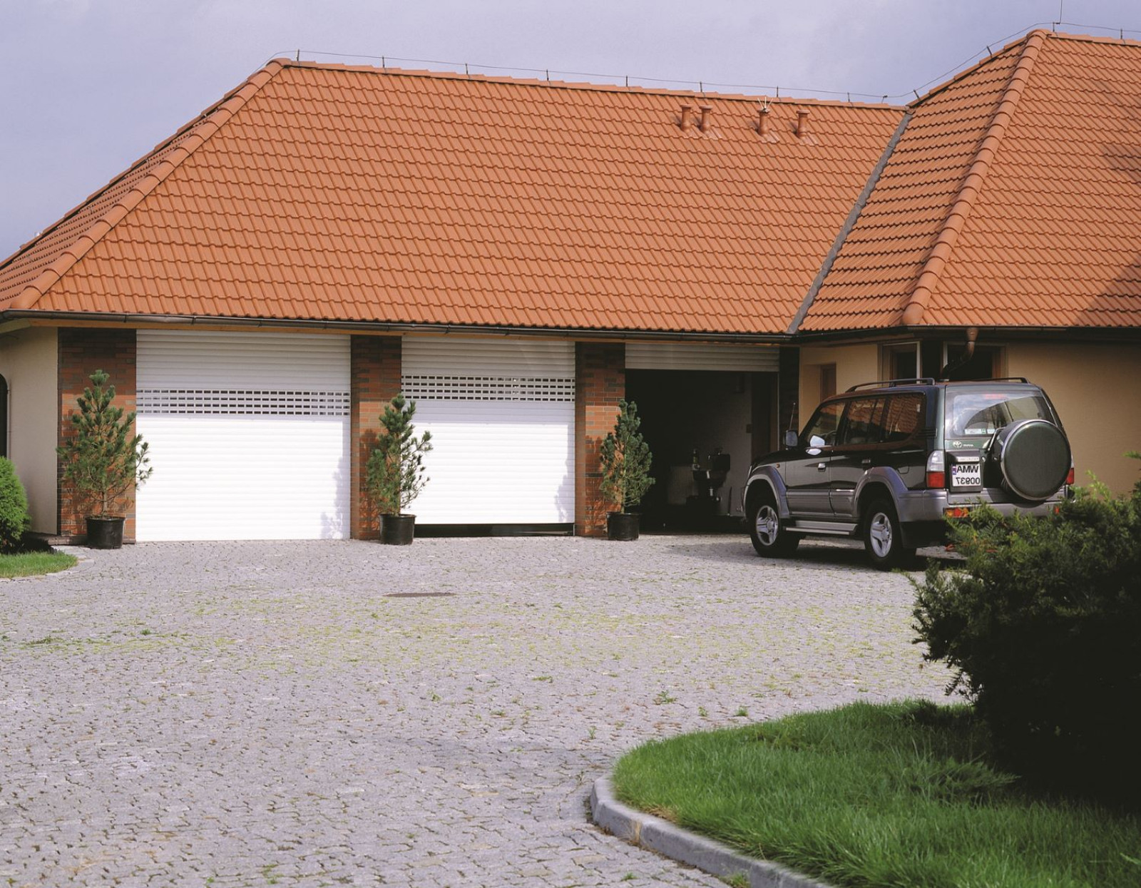 Garaż dwustanowiskowy można zamknąć jednym szerokim skrzydłem - dla wygody wjazdu większymi autami. Alternatywę stanowią dwie bramy - można otworzyć tylko jedno stanowisko, gdy jest taka potrzeba i ograniczyć straty ciepła, fot. Fakro