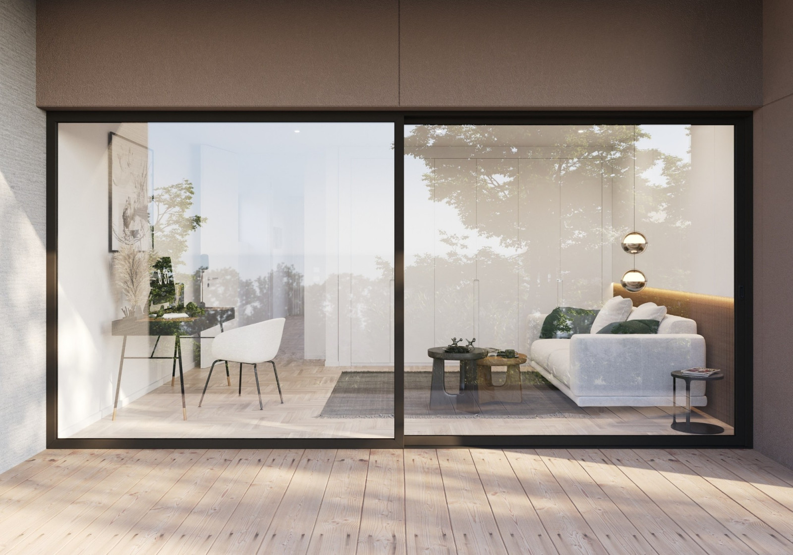 Drzwi tarasowe Schüco LivIngSlide są także dostępne w wersji Panorama z bardzo wąskimi profilami skrzydeł o widocznej szerokości zaledwie 72 mm, która oferuje jeszcze większą transparentność zgodnie z najnowszymi trendami w architekturze.
