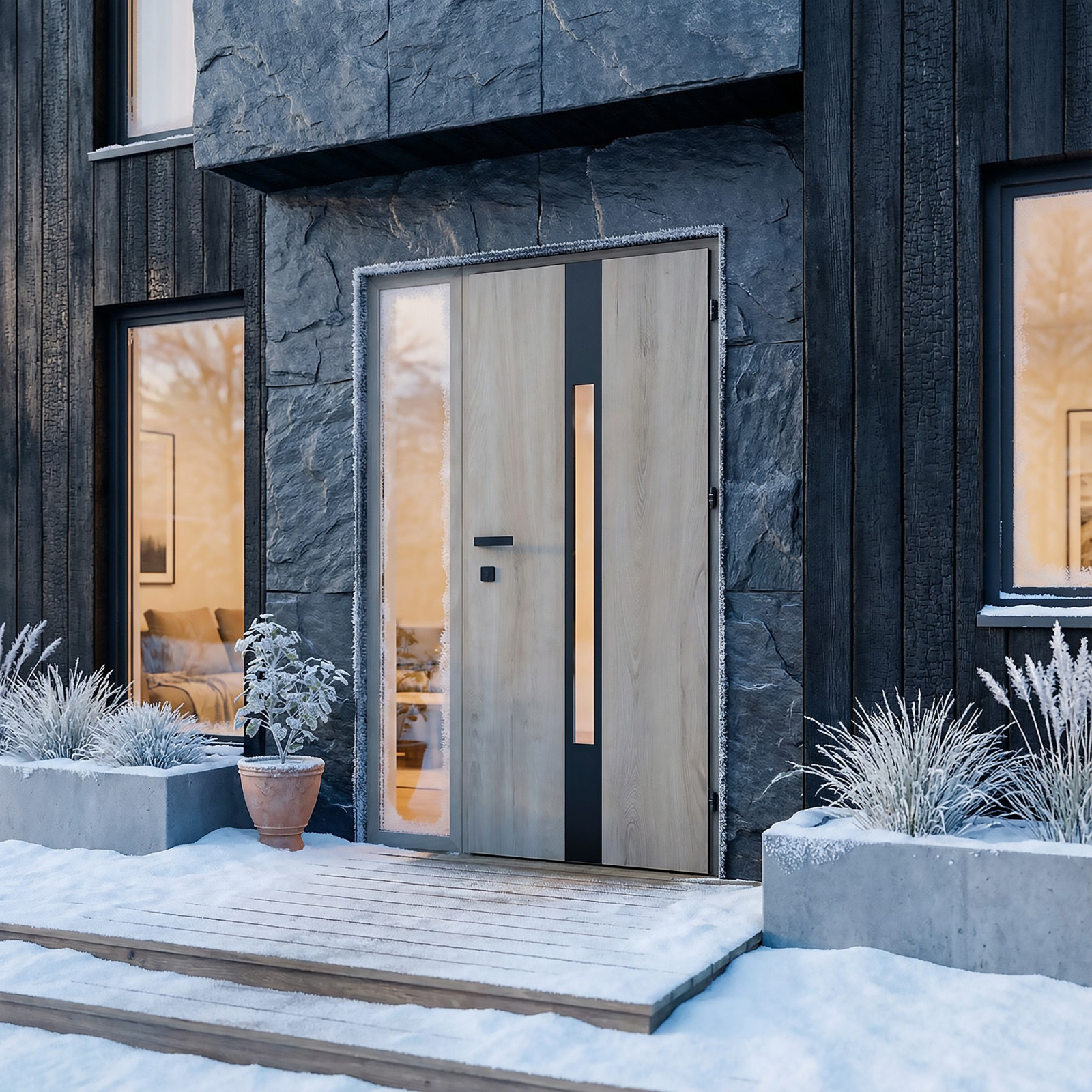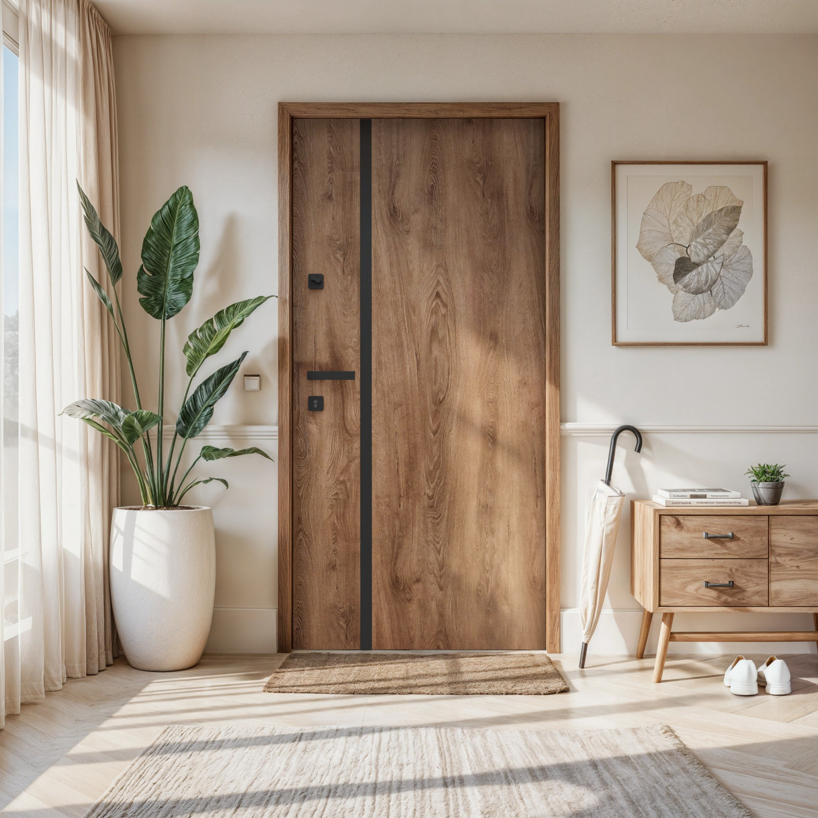 Jednym z dominujących trendów na 2026 rok jest minimalizm, który łączy prostotę formy z wyrafinowanym detalem. Drzwi zewnętrzne i wewnętrzne wejściowe coraz częściej projektowane są jako gładkie, spójne powierzchnie, idealnie dopasowane do bryły budynku. Stonowana kolorystyka, nowoczesne okleiny oraz subtelne aplikacje dekoracyjne podkreślają elegancję, nie dominując nad całością projektu.
