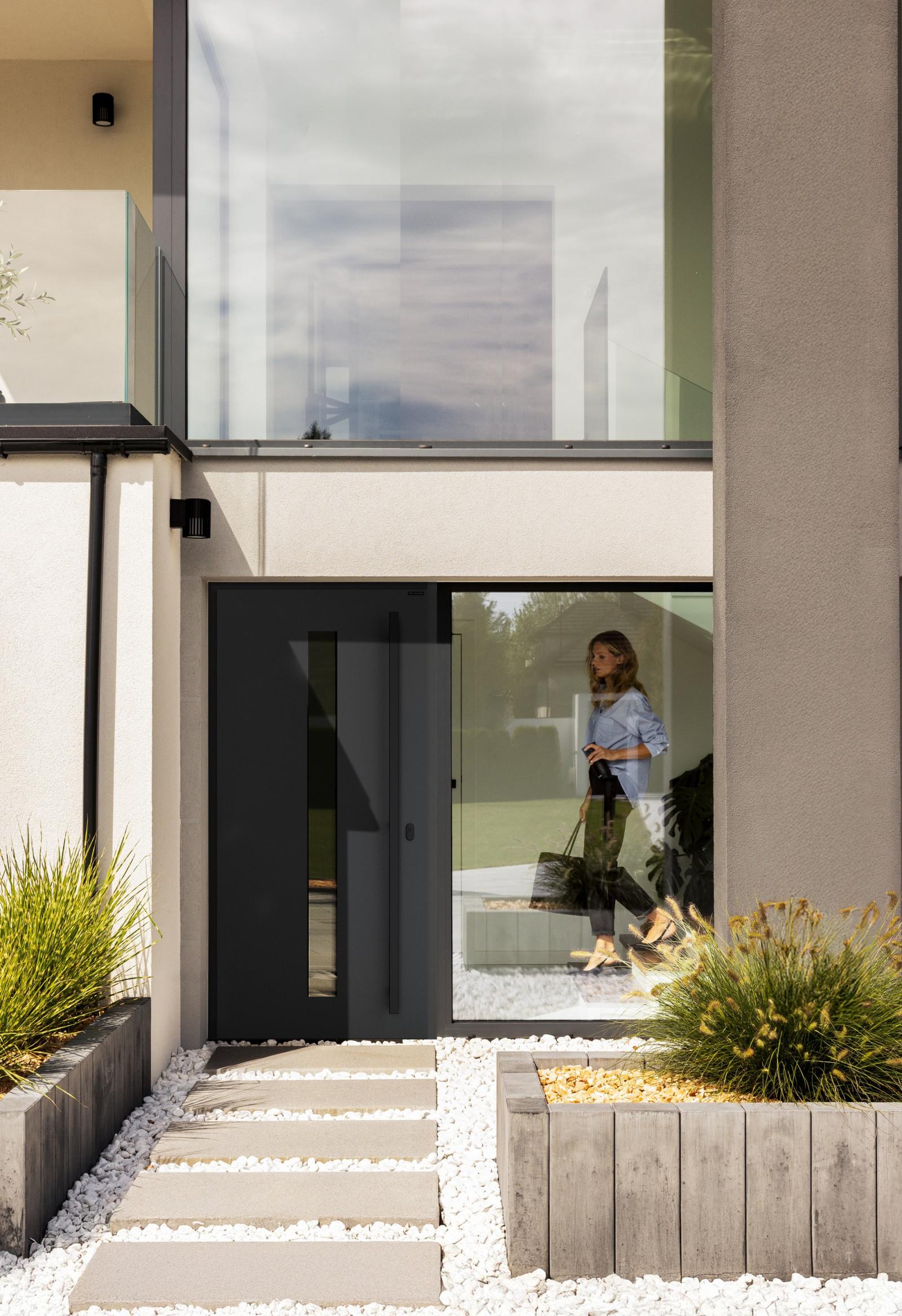 Bez zadaszenia częściej widać ślady po deszczu, kurz i pyłki. Dlatego w drzwiach premium ogromnym plusem są konstrukcje, które eliminują "zakamarki" - wystające ramki, przetłoczenia i miejsca, gdzie woda lub brud mogą się zatrzymać. W PIRUE i CREO liczy się efekt dużej, gładkiej płaszczyzny: skrzydło wygląda jak monolit, a mycie sprowadza się do przetarcia płaskiej powierzchni, z której woda swobodnie spływa. W praktyce bardzo dobrze sprawdzają się też projekty bez zbędnych zdobień - przy wejściu na odkrytej elewacji to nie tylko estetyka, ale też zwykła wygoda.