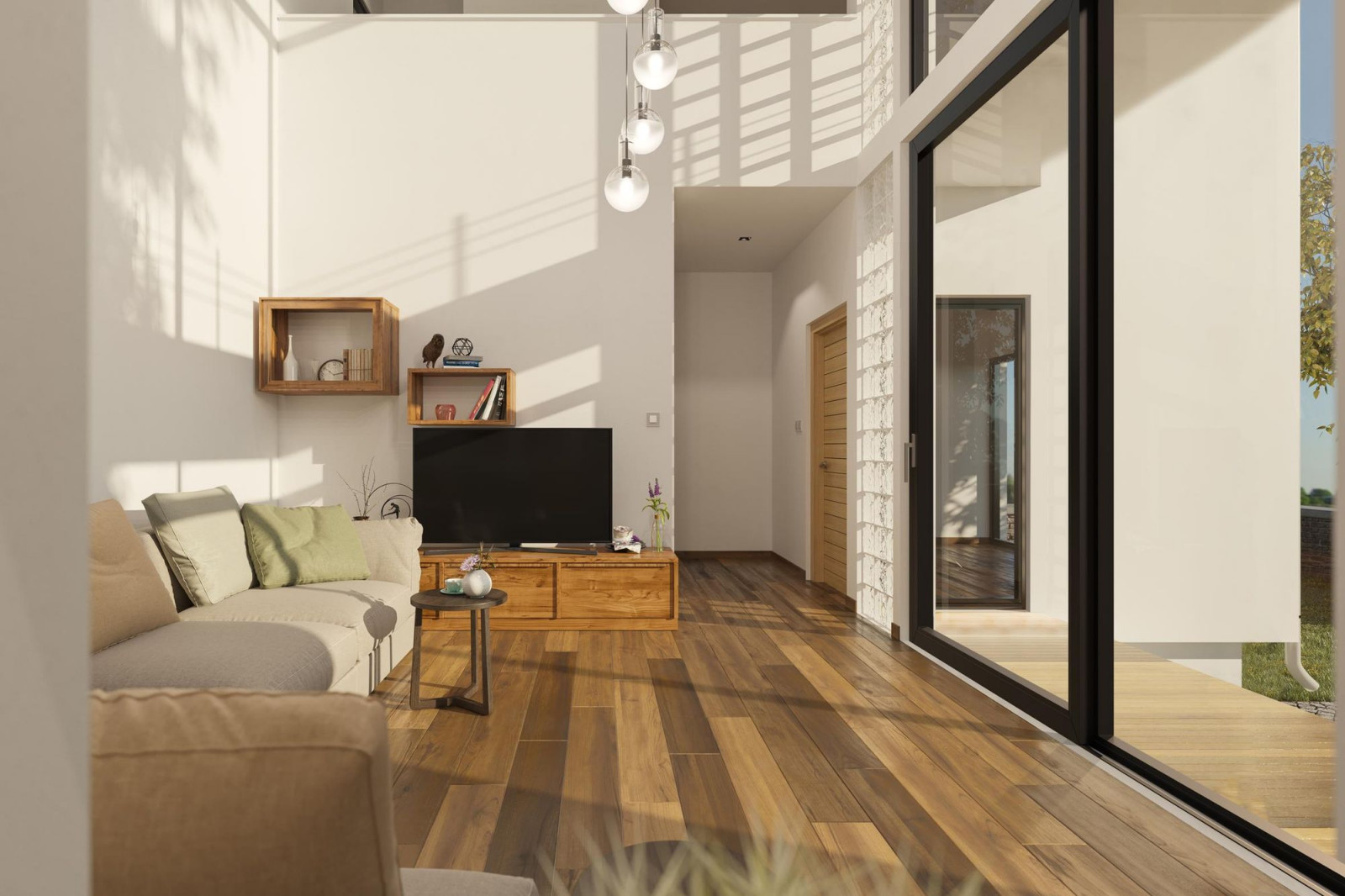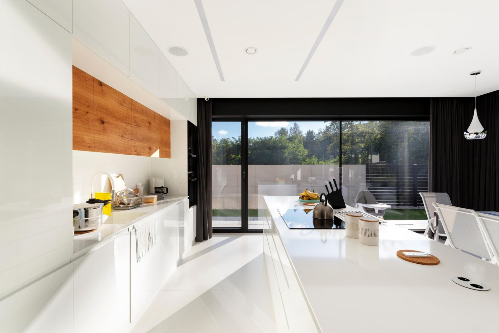 Przeszklenia wielkoformatowe są chętnie montowane we współczesnych domach. Ich zaletą jest nowoczesny wygląd i funkcjonalność. Duże tafle szkła wpuszczają mnóstwo naturalnego światła, a jednocześnie optycznie powiększają wnętrza i harmonijnie łączą je z otoczeniem. Okna rozmieszczone na południowej i zachodniej elewacji pozwalają dodatkowo na dogrzanie pomieszczeń w chłodne miesiące przy wykorzystaniu energii słonecznej.