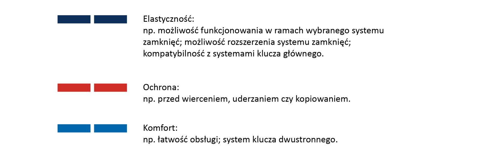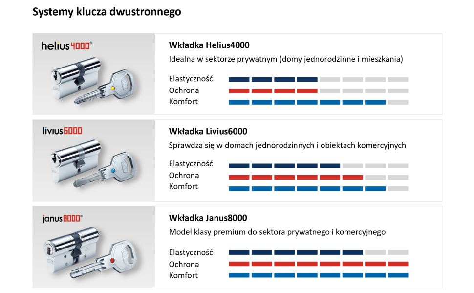 - systemy klucza dwustronnego – wygodna technika klucza dwustronnego gwarantuje szybkie wprowadzanie klucza do wkładki (w każdej pozycji), nawet przy słabym oświetleniu; klucze do wkładek tego typu objęte są dodatkowym zabezpieczeniem przed nieuprawnionym dorabianiem (karta bezpieczeństwa).