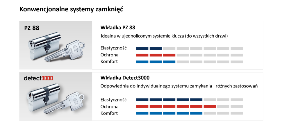 - Zalety: sprawdzony, jednorzędowy układ zapadek oraz konwencjonalne prowadzenie klucza – ta solidna konstrukcja zapewnia wysoki poziom bezpieczeństwa i łatwą obsługę.