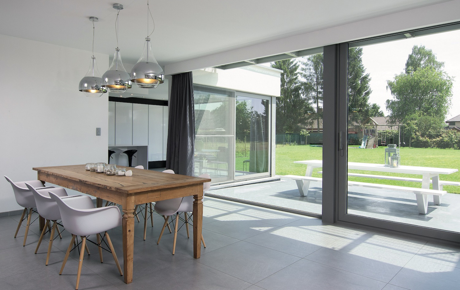 Nowoczesne technologie umożliwiają wykonywanie ruchomych przeszkleń o szerokości nawet 7 m i wysokości prawie 3 m, w układach dwu-, trzy- i czteroskrzydłowych, z różnymi konfiguracjami modułów rozwieranych lub przesuwnych. Planując duże przeszklenia, w pierwszej kolejności warto zdecydować, które ich części mogą być stałe, czyli nieotwierane. Tak zwane fixy mają cieńszą ramę, nie wymagają okuć, a przy tym są tańsze i zwykle lepiej izolują termicznie oraz akustycznie niż wersje otwierane. Na parterze fixy warto montować tam, gdzie można je wygodnie umyć, np. od strony tarasu. Przeszklenia stałe, w tym panoramiczne, można wykonać w bardzo dużych formatach z jednej tafli szkła, bez dodatkowych podziałów. Pozwala to uzyskać efekt niemal niewidocznej szklanej przegrody.