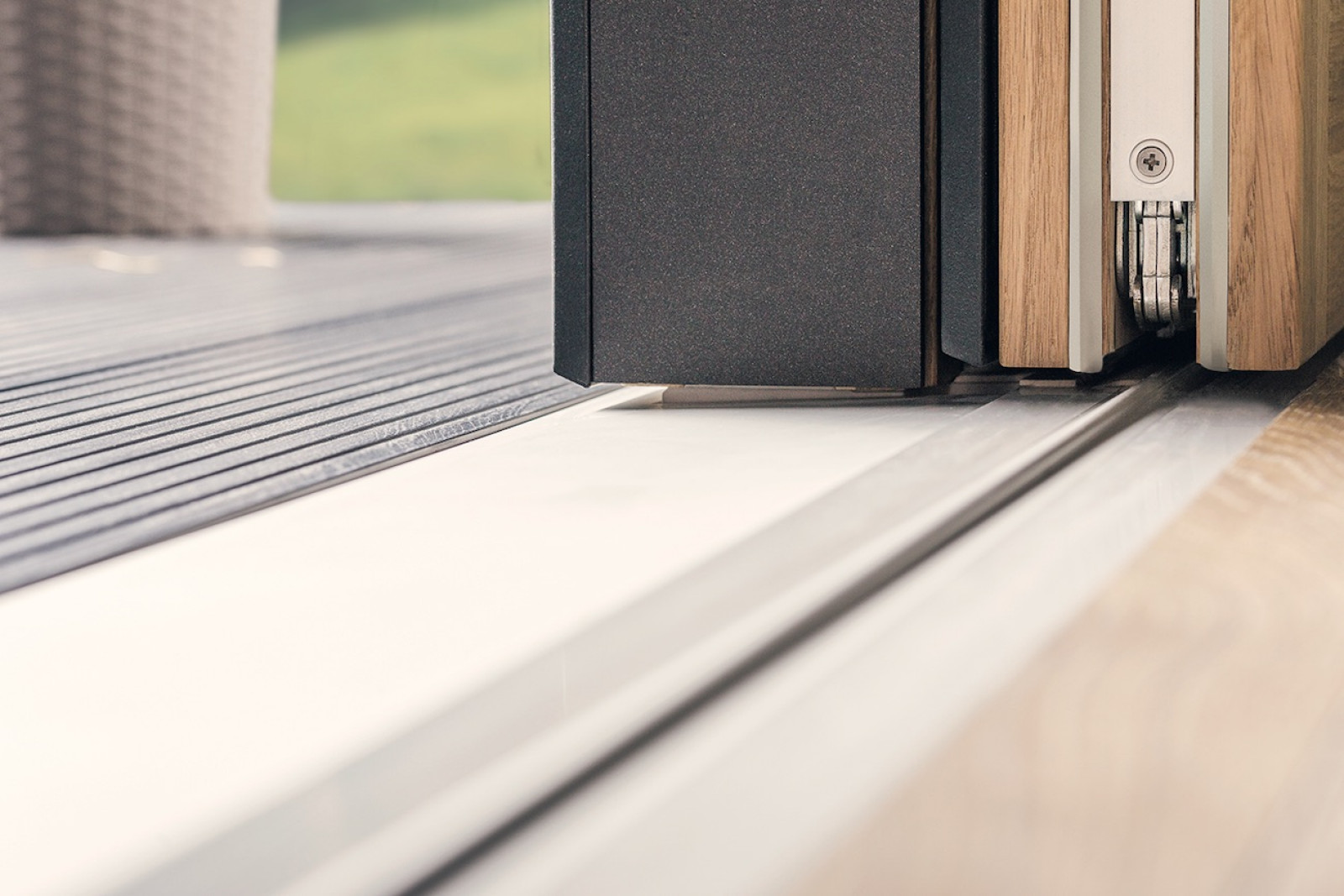 Istnieje także możliwość zainstalowania niskiego progu w wersji bez barier. Ponieważ szerokie drzwi tarasowe są ciężkie, w przypadku systemów przesuwnych warto rozważyć zastosowanie napędu, który ułatwi codzienną obsługę wszystkim domownikom.