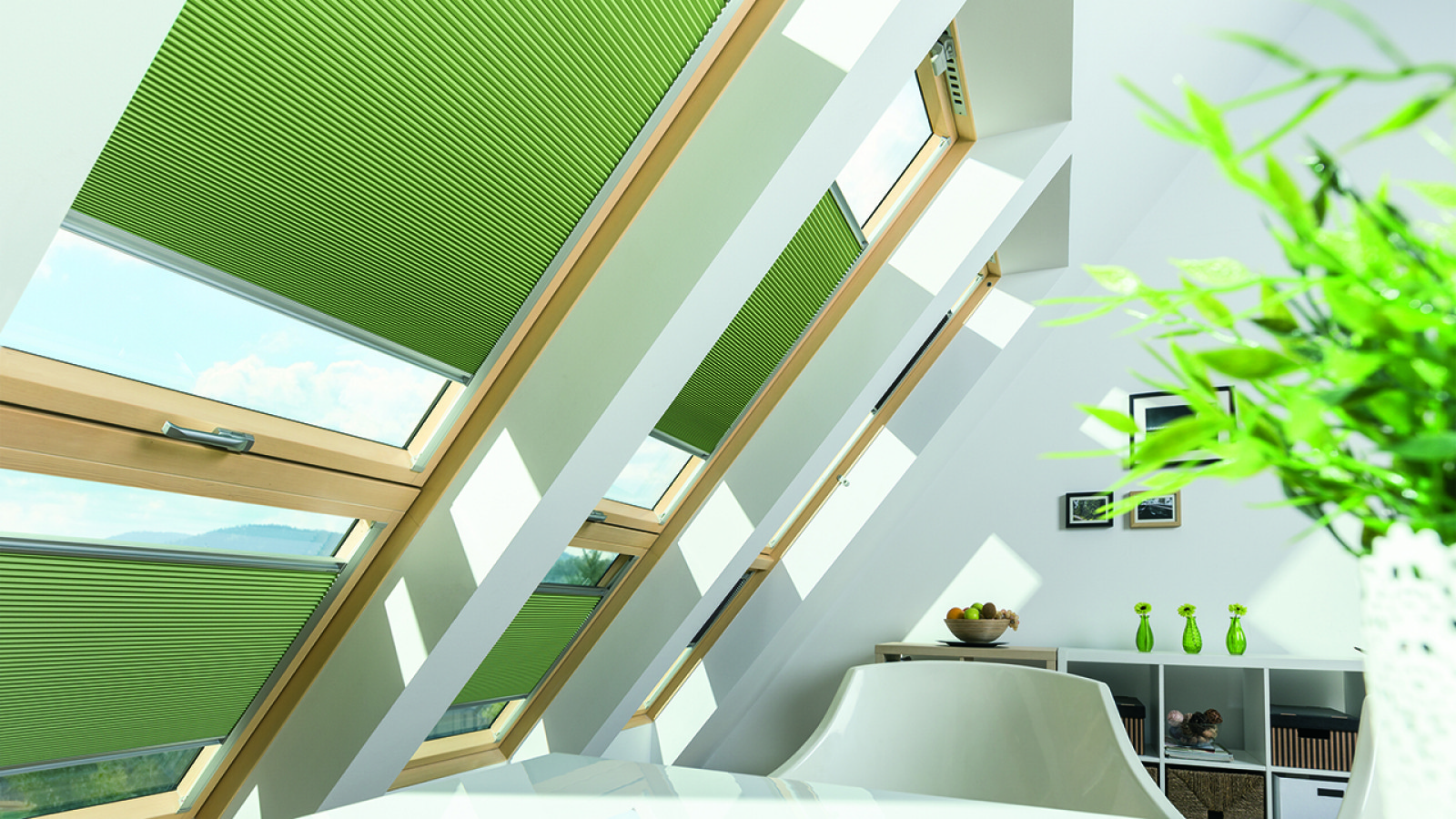 Zielony akcent można wprowadzić również za pomocą wewnętrznych akcesoriów do okien dachowych. Rolety FAKRO są dostępne w różnych odcieniach zieleni, dlatego mogą być zarówno praktycznym elementem wyposażenia, jak i spójnym dodatkiem do aranżacji. Pozwalają regulować ilość światła wpadającego do pomieszczenia, a wybrane modele z systemem top-down można wygodnie obsługiwać za pomocą górnej i dolnej belki.