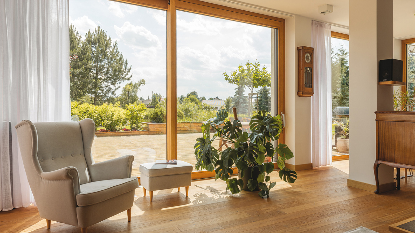 Kontakt z naturą we wnętrzu wzmacniają także rozwiązania z linii FAKRO INNOVIEW. Wielkopowierzchniowe przeszklenia otwierają dom na ogród i doświetlają pomieszczenia. Drzwi tarasowe HST zapewniają wygodne wyjście na zewnątrz, między innymi dzięki niskiemu progowi o wysokości 5 mm.
