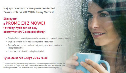 Aby skorzystać z promocji zimowej Vetrex należy złożyć zamówienie do 28 lutego. Upust łączy się z rabatem skonto. Więcej szczegółów w salonach sprzedaży.