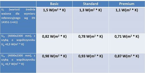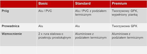 Dzięki swobodzie wyboru różnych kombinacji profili w części nadproża drzwi i w części progowej mamy możliwość wyboru między trzema opcjami: Basic, Standard i Premium, które skierowane są do różnych grup odbiorców o zróżnicowanych wymaganiach odnośnie izolacyjności termicznej.