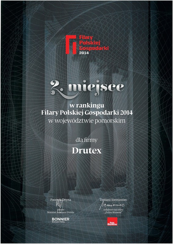 DRUTEX został wyróżniony w rankingu "Filary Polskiej Gospodarki" w województwie pomorskim. Firma została zaliczona do przedsiębiorstw, które mają największy wpływ na rozwój regionu, wyróżniają się efektywnością zarządzania i dynamicznym rozwojem.